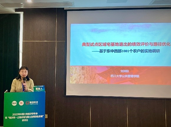 刘润秋教授在此次会议“城乡统一土地市场建设”分会场担任主持人,并做了题为“典型试点区域宅基地退出的绩效评价与路径优化——基于东中西部1001个农户的实地调研”的学术报告,从宅基地退出绩效目标剖析、绩效评价框架重构、绩效评价实证考察和绩效评价结果反思几个方面,与参会专家、学者进行了深入交流。