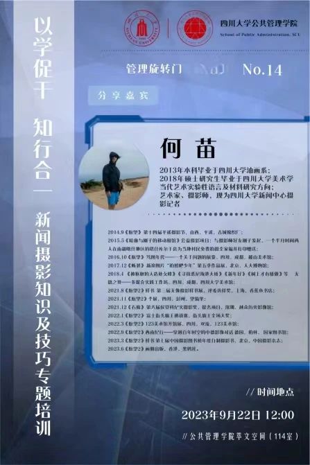 9月22日,pc加拿大网站预测推荐在学院萃文空间开展第14期“管理旋转门”活动。本期活动特邀四川大学新闻中心何苗老师作为主讲嘉宾分享新闻摄影知识及技巧。