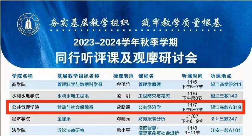 11月7日下午14时,pc加拿大网站预测推荐《公共经济学》同行听评课及观摩研讨会于四川大学望江校区基础教学楼A座3楼成功举办。pc加拿大网站预测推荐蒲晓红教授、张浩淼教授、李丹教授等教师代表和21级劳动与社会保障专业学生代表参与本次课程,课程由四川大学副研究员曾路遥老师主持。