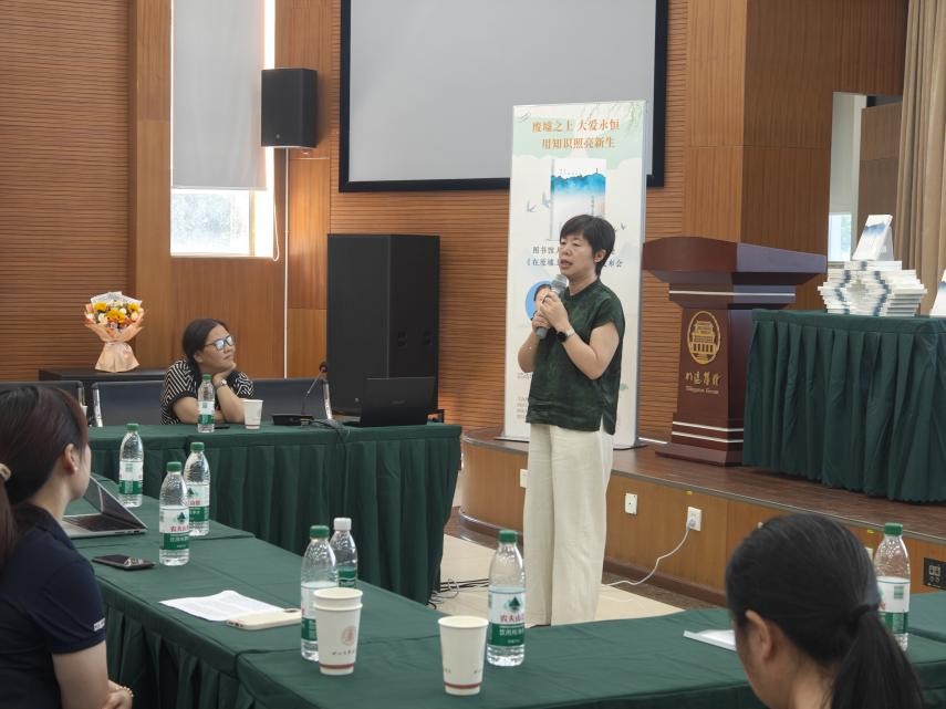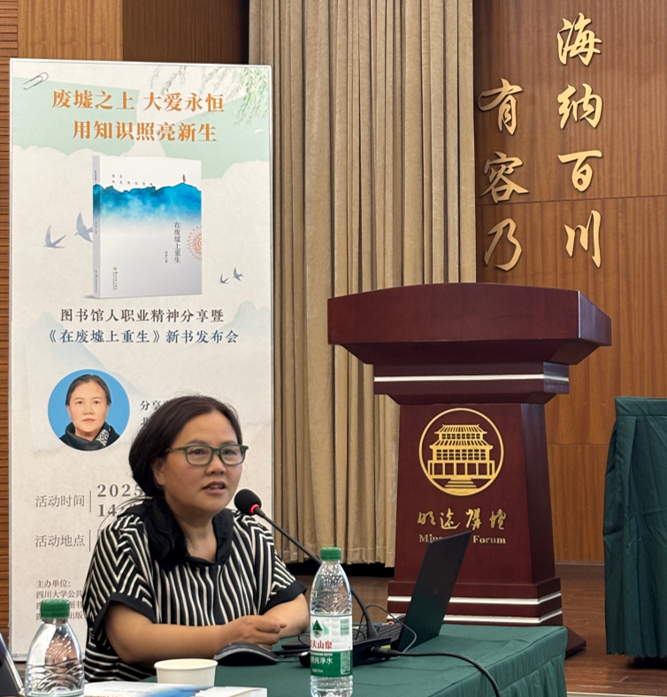 随后,本次分享会特邀北川图书馆原馆长、《在废墟中重生》作者李春老师以亲历者视角,为大家深情讲述了汶川5·12大地震后北川图书馆浴火重生的艰难历程。在重建过程中,图书馆人克服余震频发的安全威胁,在艰苦条件下开展图书抢救与废墟清理工作。从基础功能恢复到服务体系优化,最终实现北川图书馆从震前县级三级图书馆向国家级一级图书馆的跨越式发展。这一蜕变生动诠释了在党中央“以人为本、尊重科学、不畏艰险、百折不挠”的抗震救灾精神指引下,图书馆工作者为人民服务、为文化事业拼搏的担当与奉献。
