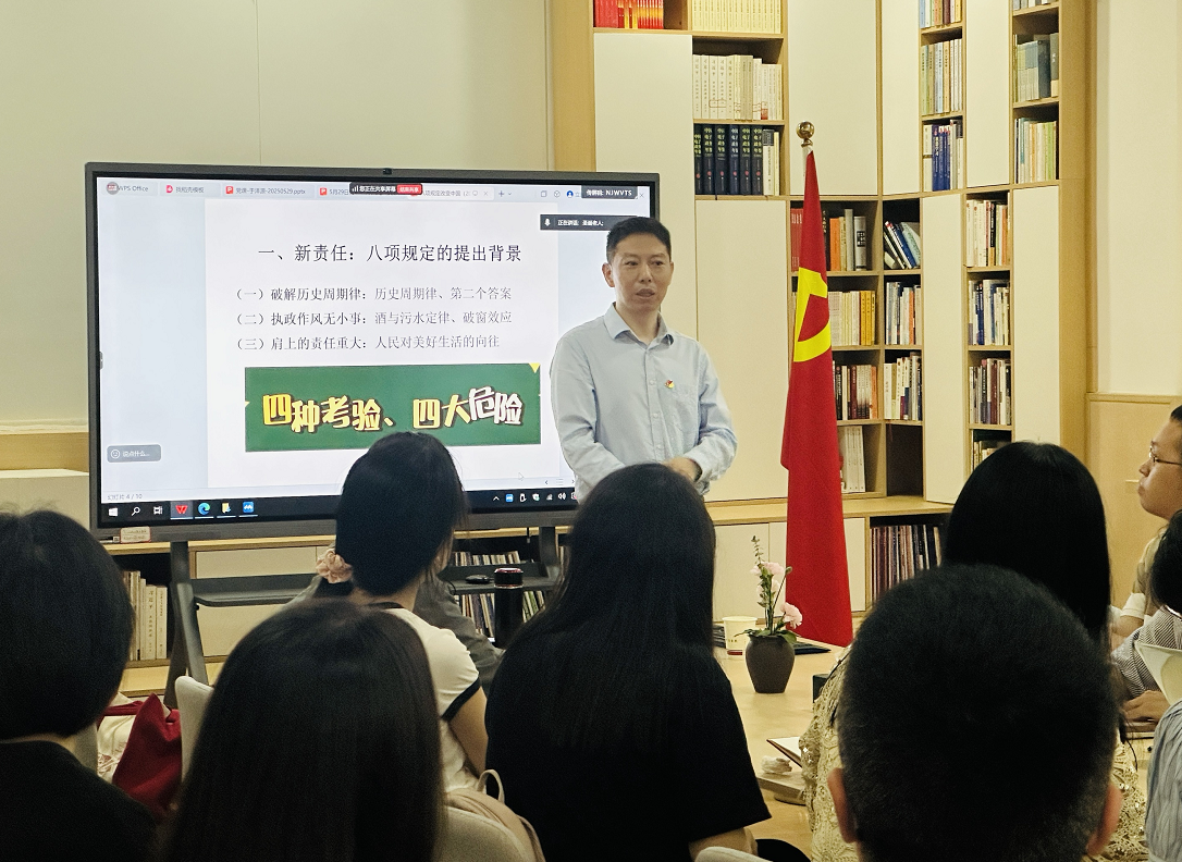 支部特别邀请了四川省委宣讲团成员、学院党委委员、范逢春副院长讲授专题党课。范老师以“八项规定改变中国”为题,系统阐述了八项规定的提出背景、基本内涵、实践效果以及时代图景,深刻解析了八项规定与党的自我革命、国家事业发展、个体成长的内在关系。他强调,党的作风建设永远在路上,党员同志要自觉遵规守纪、主动学习,不断提高党性修养和拒腐防变能力。