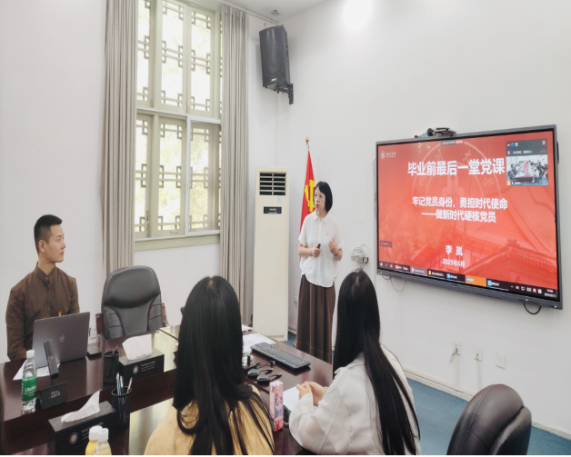 为认真落实学校关于2025届毕业生党员教育管理工作,引导毕业生党员坚定理想信念,牢记使命担当,6月13日,学院博士生第一党支部在萃文楼311会议室举行了“最后一堂党课”主题教育活动,本次活动由支部书记李岚主持,博士生辅导员徐文健和2021级全体博士生党员参与。