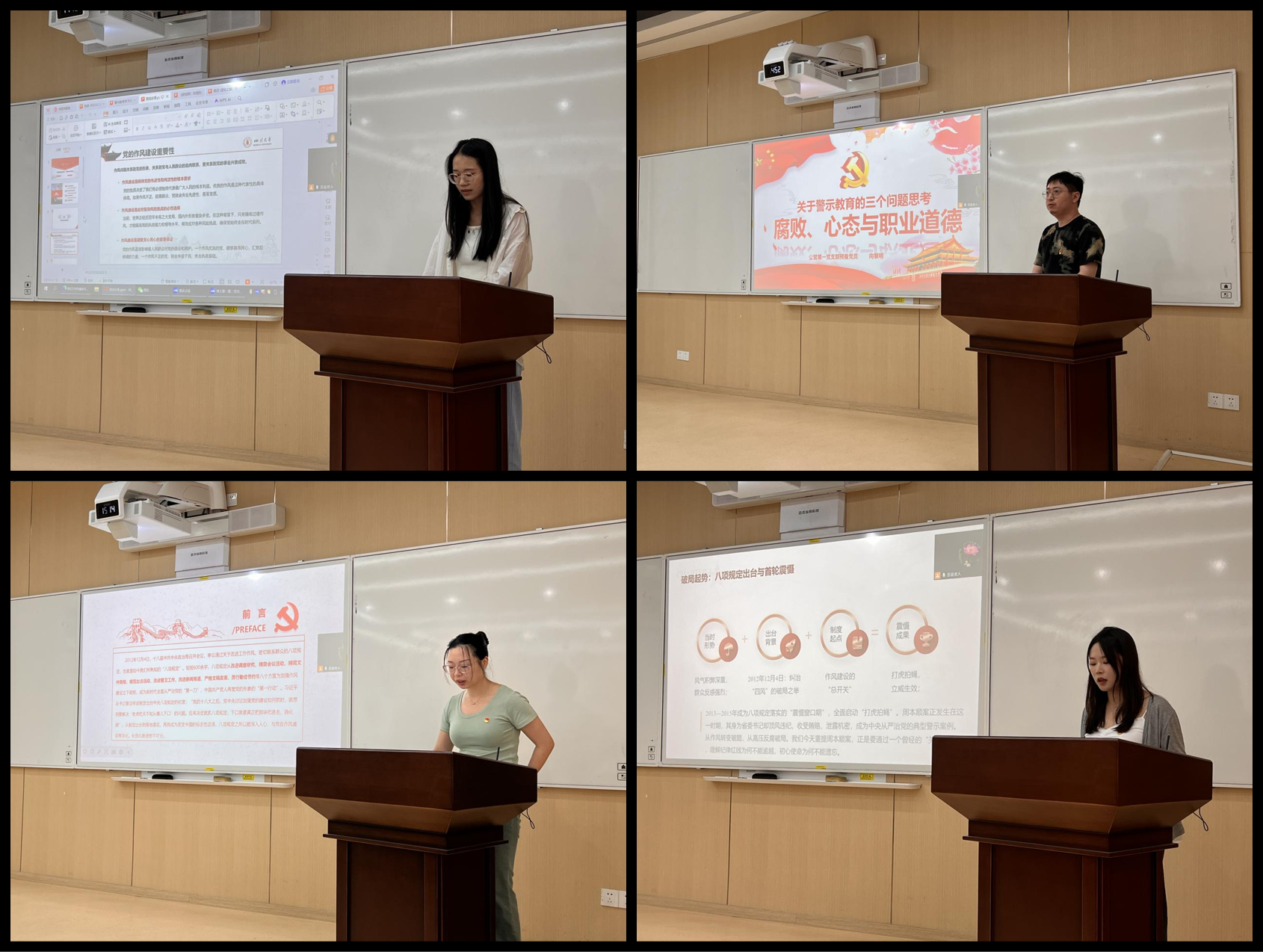 博士生黄琳、向黎明、胡怡婷及蒋欣通过剖析典型腐败案例,并结合自身学习体会,精准提炼腐败根源与警示教育差异化效果的关键,阐明了“纪律红线不可逾越、初心使命不可遗忘”的深刻内涵。