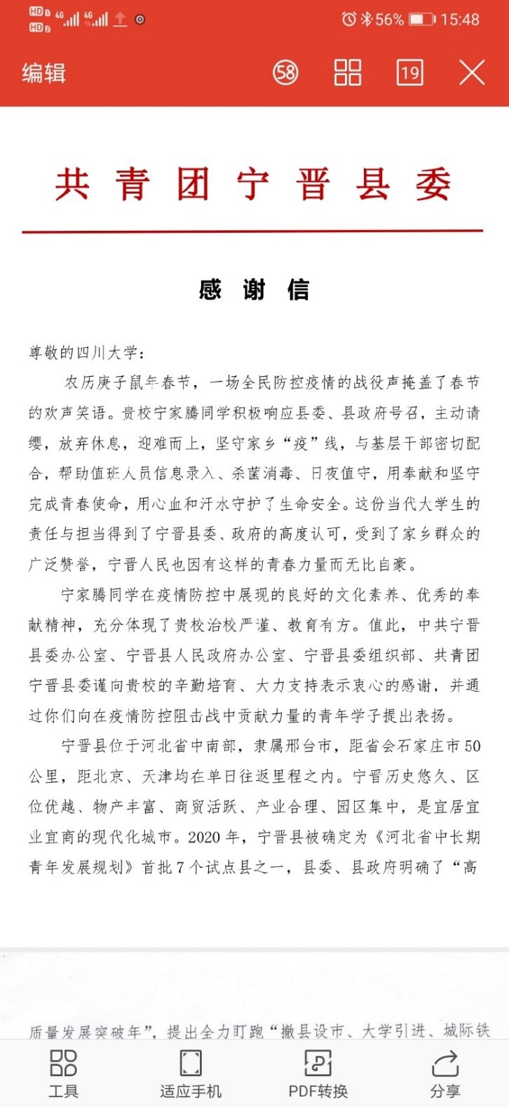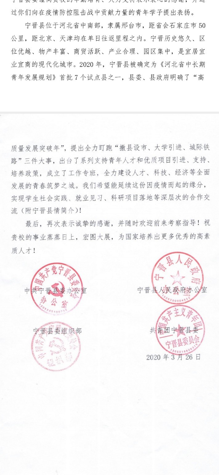 近日,我院收到了来自河北省宁晋县的一封感谢信。信中表达了对我院研究生宁家腾同学积极响应政府号召,主动参与家乡疫情防控工作的高度赞扬,同时表达了对我校及我院培养工作的充分认可与真挚谢意。