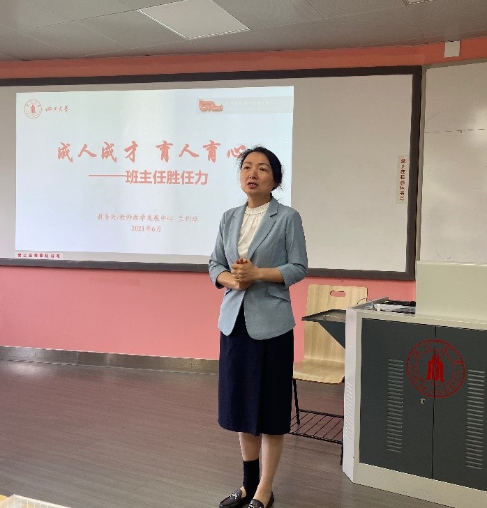 从学习贯彻习近平总书记全国教育大会重要讲话精神引入,兰利琼教授强调了“教育回归本位,教师作为领路人”的重要性。她解读了《四川大学班主任工作指导意见(试行)》,并从具备较高的专业水平、高度的责任感、与社会实践相结合、发挥老师的人格魅力、引导学生的全面健康成长等方面重点讲述了班主任工作的职责。她结合心理学相关知识,通过真实、鲜活的案例,阐述了班主任全方位引导学生成长人才、促进教育事业高水平发展的重要作用。