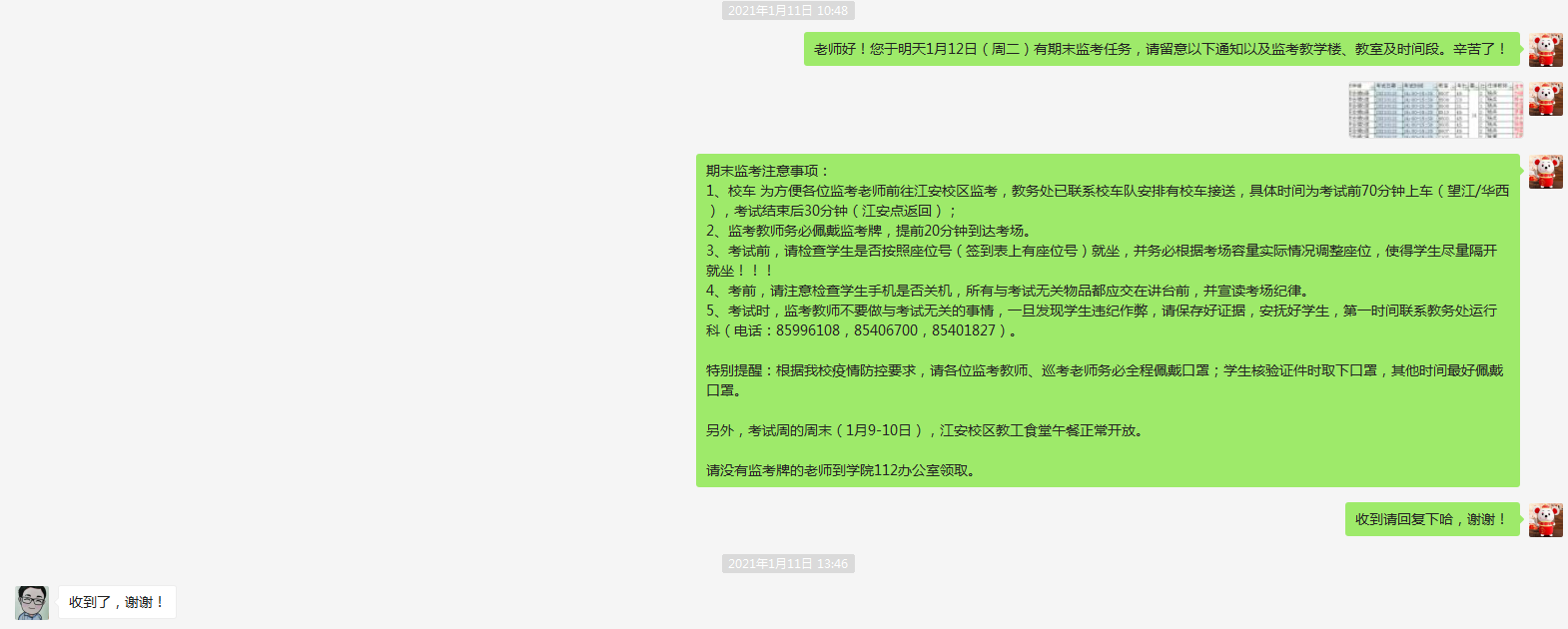 学院制定有《pc加拿大网站预测推荐本科生考试监考工作暂行规定》(川大公管﹝2020﹞6号文)专门文件对监考人员安排进行规范管理。监考人员确定后,建立单独微信群,发布考风考纪宣传教育PPT及其他注意事项。考试前一天,安排教务人员通过微信、电话、OA等方式逐一提醒监考教师注意监考教学楼、教室、时段等信息,确保监考教师收到通知并回复。